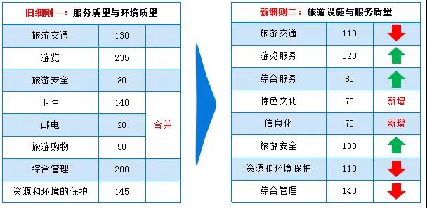《服務(wù)質(zhì)量與環(huán)境質(zhì)量評分細則》更名為《設(shè)施與服務(wù)質(zhì)量評分細則》,仍由八個大項構(gòu)成,但對原來八個大項的相關(guān)內(nèi)容進行了一些合并與調(diào)整,重點突出了特色文化、信息化、綜合服務(wù)和旅游安全四大方面的內(nèi)容,對景區(qū)在文化建設(shè)、游覽設(shè)施、旅游要素配置、旅游安全、智慧景區(qū)等方面提出了新的和更高的要求。