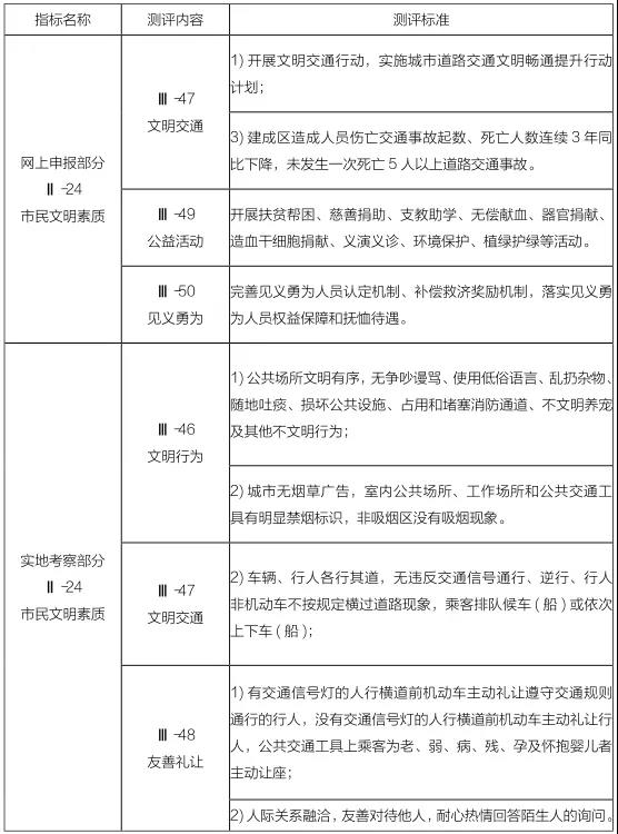 對照《全國文明城市測評體系》的網(wǎng)上申報、實地考察、問卷調(diào)查 3 種方式的測評指標,其中網(wǎng)上申報第 24 條、實地考察第24 條測評指標均詳細列出對市民文明素質(zhì)的要求。網(wǎng)上申報部分主要有市民文明交通、公益活動、見義勇為三個測評內(nèi)容,具體要求涵蓋文明交通、扶貧幫困、慈善捐助、支教助學(xué)、無償獻血、器官捐獻、造血干細胞捐獻、義演義診、環(huán)境保護、植綠護綠、見義勇為 11 項文明行為。實地考察部分主要有文明行為、文明交通、友善禮讓三個測評內(nèi)容,具體包括無爭吵謾罵、不使用低俗語言、不亂扔雜物、不隨地吐痰、不損壞公共設(shè)施、不占用和堵塞消防通道、禁煙區(qū)不吸煙、文明排隊、文明養(yǎng)寵、文明交通、主動禮讓行人、公交車主動讓座等