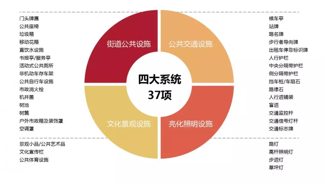 我們根據(jù)城市家具的功能屬性,對城市家具各類設(shè)施進(jìn)行系統(tǒng)性分類,依據(jù)現(xiàn)狀,可暫分為街道公共設(shè)施、公共交通設(shè)施、文化景觀設(shè)施、亮化照明設(shè)施四大系統(tǒng)三十七項。