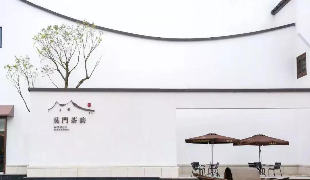 入口門頭的設(shè)計,極具蘇式建筑特色,“白墻黛瓦人字線條+圓形鏤空墻布隔斷+搭配小型池水裝飾”,很有蘇州園林的城市辨識度。