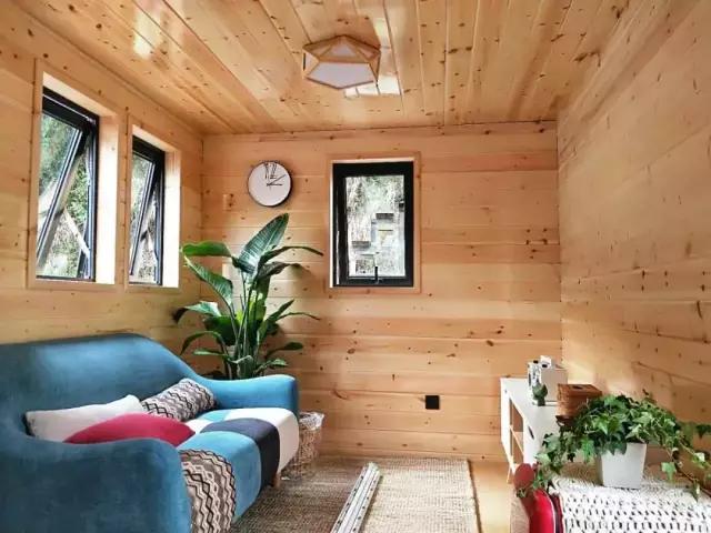沿著階梯上到一層,一進(jìn)門就是舒適的雙人床和超大的落地玻璃窗,窗口望出去一片綠意盈盈。室內(nèi)擺放的都是純天然原木家具和手工粗陶餐具,配有地暖、空調(diào)、迷你冰箱、藍(lán)牙音箱等設(shè)備,堪稱自然與現(xiàn)代相結(jié)合的典范。