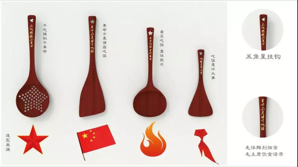 此款炊具套裝正是暗指“治大國若烹小鮮”的比喻,提醒黨員們應保持嚴謹的態(tài)度。炊具選用代表紅色文化的棗木材質,包含漏勺、鏟子、湯勺和飯勺四件,掛鉤處設計為五星形狀,手柄處刻有毛主席的經典飲食語錄,底部分別將紅五星、紅旗、火苗、紅領巾元素融入造型中。毛氈包裝設計的尤為巧妙,將其上扣子打開后可作為隔熱墊使用,棗木的包裝底板還可作為隔熱板使用,最大程度實現包裝的二次利用,既環(huán)保又美觀。