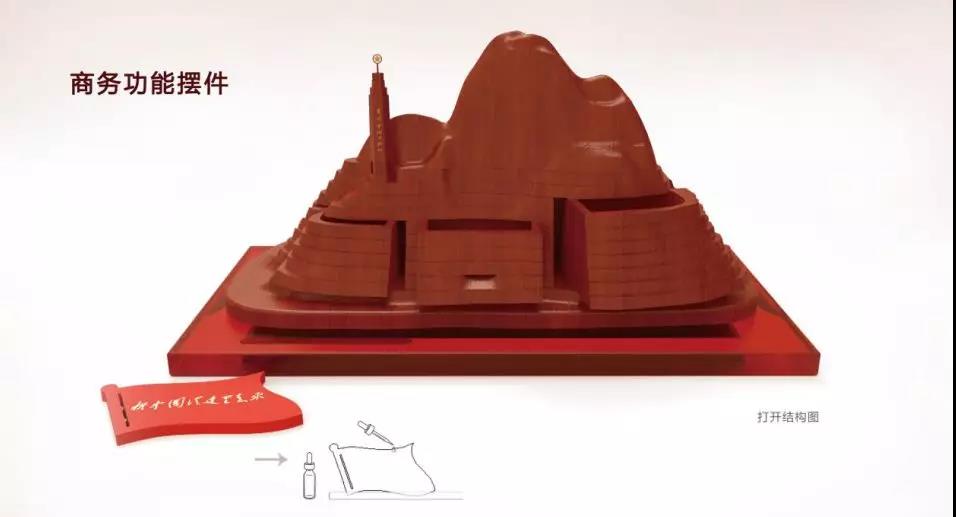 “柏坡印象”為一款商務功能擺件,五座連綿起伏的山峰代表西柏坡紀念館前的五偉人形象,“山”上坐落著西柏坡紀念塔精致的同比例木雕?!吧健鼻帮h揚的紅旗毛體寫著新中國從這里走來,紅旗為毛氈材質可作為香薰載體,精油滴進,散發(fā)陣陣幽香。