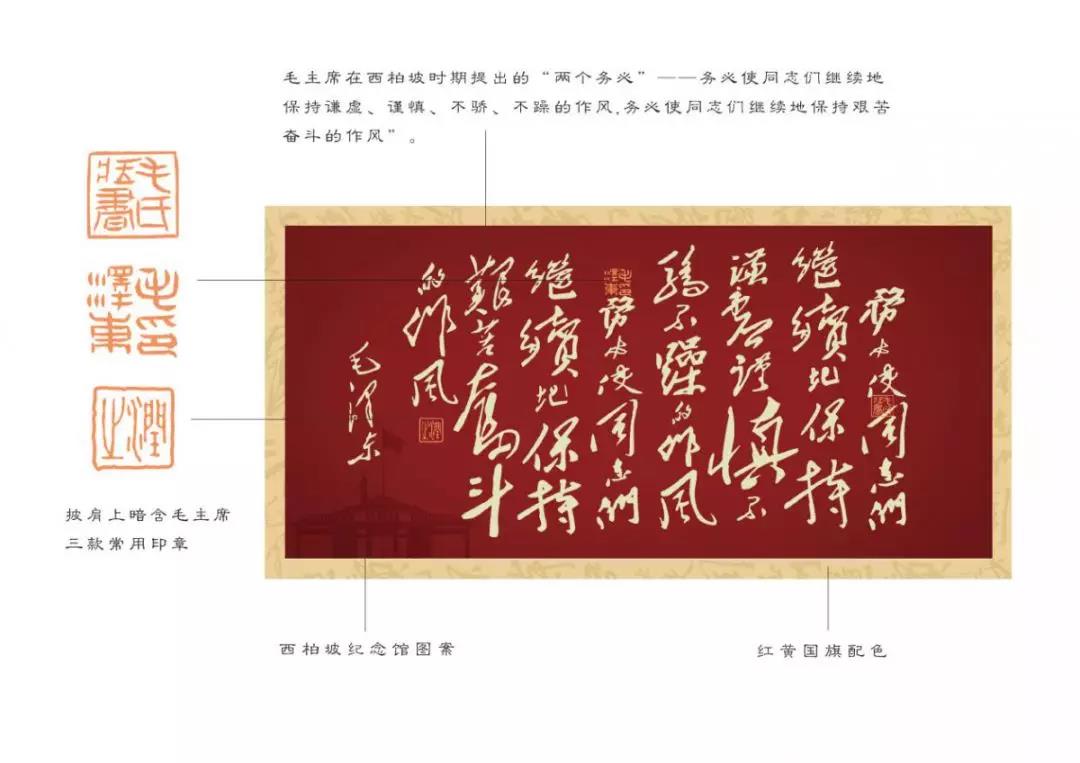 此款《務必絲巾》以西柏坡時期毛澤東同志提出的“兩個務必”為設計來源,將毛主席書法、印章和西柏坡紀念館圖案三種設計元素融入其中,紅色與黃色的國旗配色彰顯紅色文化,采用100%桑蠶絲材質,輕薄透氣。絲巾披在身上,仿若一副行走的書法作品。
