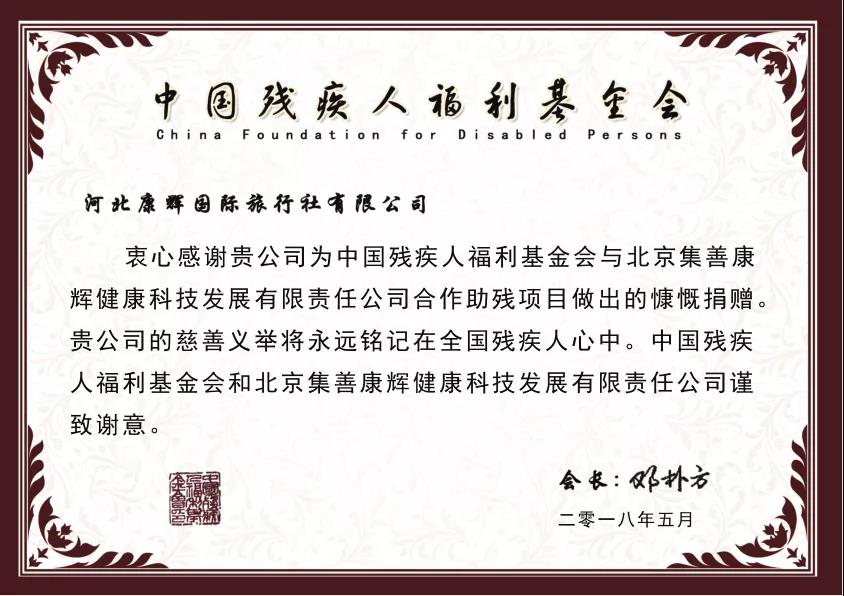 2018年5月,中國殘疾人福利基金會為康旅集團(tuán)頒發(fā)榮譽(yù)獎牌。
