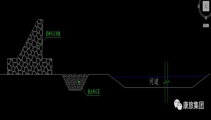 開(kāi)挖溝渠后,施工團(tuán)隊(duì)便著手按盲溝寬度進(jìn)行刷坡整治,防止裸露的邊坡帶來(lái)水土流失等環(huán)境問(wèn)題,將生態(tài)建設(shè)的每一個(gè)微小環(huán)節(jié)落到實(shí)處。進(jìn)而沿盲溝壁底鋪設(shè)防水布,并在形成分隔層的盲溝內(nèi),嚴(yán)格按照排水坡度填充碎石;之后鋪設(shè)排水管,在保證管道高度符合設(shè)計(jì)要求的前提下,繼續(xù)增加石子濾水層至盲溝頂部,如此,地下水便可通過(guò)碎石間的縫隙,流向下游河道,避免對(duì)擋墻造成侵蝕。