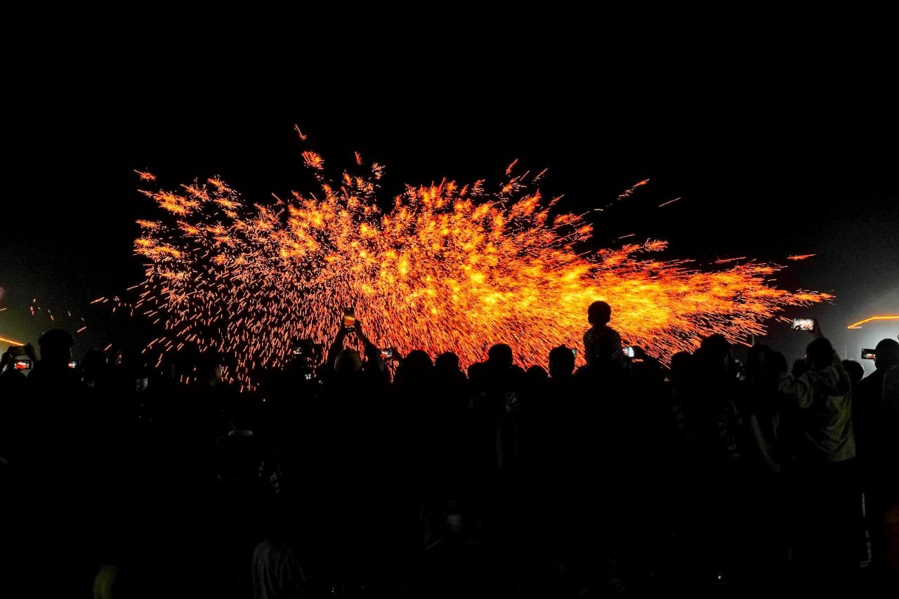 打造系列品牌活動,讓伏羲文化更火、更活、更生動。在伏羲臺璀璨的夜空下,無人機星空秀勾勒出新樂地標與伏羲圖騰的恢弘畫卷,用新質(zhì)生產(chǎn)力詮釋千年文明,營造出震撼人心的視覺盛宴?;樗孜幕?jié)現(xiàn)場,開展中華民族婚俗文化特色展示活動,創(chuàng)新打造“打卡伏羲臺 免費吃家宴”活動品牌。在非遺表演環(huán)節(jié),打樹花、火壺、火刀火棍、火扇火舞等項目在夜空中劃出一道道璀璨的花火,成為游客爭相打卡的亮點。
